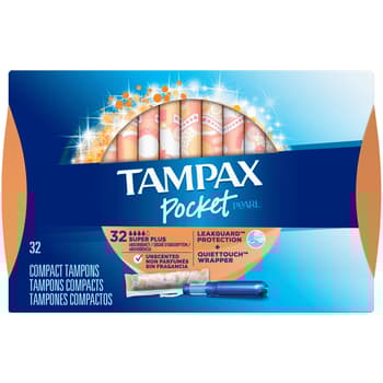 Tampax Pearl Plastic Tampons, Super Plus Absorbency, Unscented, 50 Count, Tampax Pearl Plastic Tampons, Triple pack, Regular/super Plus Absorbency, Unscented, 34 Count, Tampax Pearl Plastic Tampons, Super Plus Absorbency, Unscented, 36 Count,Pack of 2, Tampax Pearl Active Plastic, Regular Absorbency, Unscented Tampons, 36 Count, Tampax Pearl Plastic, Super Plus Absorbency, Unscented Tampons, 18 Count, Tampax Pearl Tampons Super Absorbency with LeakGuard Braid, Unscented, 50 Count, Always Radiant Pads, Size 2, Heavy Flow Absorbency, Scented, 26 Count, Always Radiant Daily Feminine Panty Liners for Women, Regular Absorbency, Unscented, Wrapped, 96 Count (Pack of 4), Tampax Pearl Plastic Tampons, Super Plus Absorbency, Scented, 36 tampons, Gold Bond Ultimate Healing Skin Therapy Lotion, 14 oz, Differin Adapalene Gel 0.1% Acne Treatment, 0.5 Ounce, TriDerma Hand Sanitizer No Rinse Cleansing Gel, 70% Alcohol 4 Pack, Contains 4 2.2 ounce tubes, Made in the USA, Rite Aid Pharmacy Tampons, Plastic Applicator, Super, Unscented, 50 tampons, Always Infinity Pads with Wings, Heavy Flow, 46 Count, OTC Rib Belt for Women, 6-Inch Elastic Chest, Select Series, Universal Regular, OTC Rib Belt for Men, 6-inch Elastic Chest Compression, Select Series, Large, Built-In Backup braid helps stop leaks by channeling them back into the core, FormFit protection gently expands to your unique shape, Applicator has a smooth, rounded tip and anti-slip grip for comfortable tampon insertion, Easy-open wrapper allows for effortless disposal, Tampax Pearl tampons give you up to 8 hours of comfortable, leak-free protection. Your tampon should be, too, LeakGuard Braid helps stop leaks before they happen, Anti-Slip Grip on applicator makes the tampons easy to insert, Gently expands to your individual shape thanks to Tampax FormFit protection, Free of perfume and chlorine bleaching with a core free of dyes* (*Braid has skin-friendly pigments), Tampax Pearl Super Plus Absorbency tampons are clinically tested** to be gentle on skin, and designed with your body in mind (**Clinical data on file). unscented tampons tampax