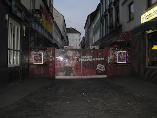 In the back you can see the street "Groe Freiheit" with some passants walking around, where the Beatles started their carreer in several clubs. The Herbertstrae is about 100 meters long, in the houses sit the prostitutes on stools in windows, present themselves and wait for suitors or address the male passers-by with the window open. The neighbourhood first began to develop outside the gates of Hamburg on what was known as Hamburger Berg (or Hamburg Mountain) and close to Altona, then under the administration of the Danish monarchy.