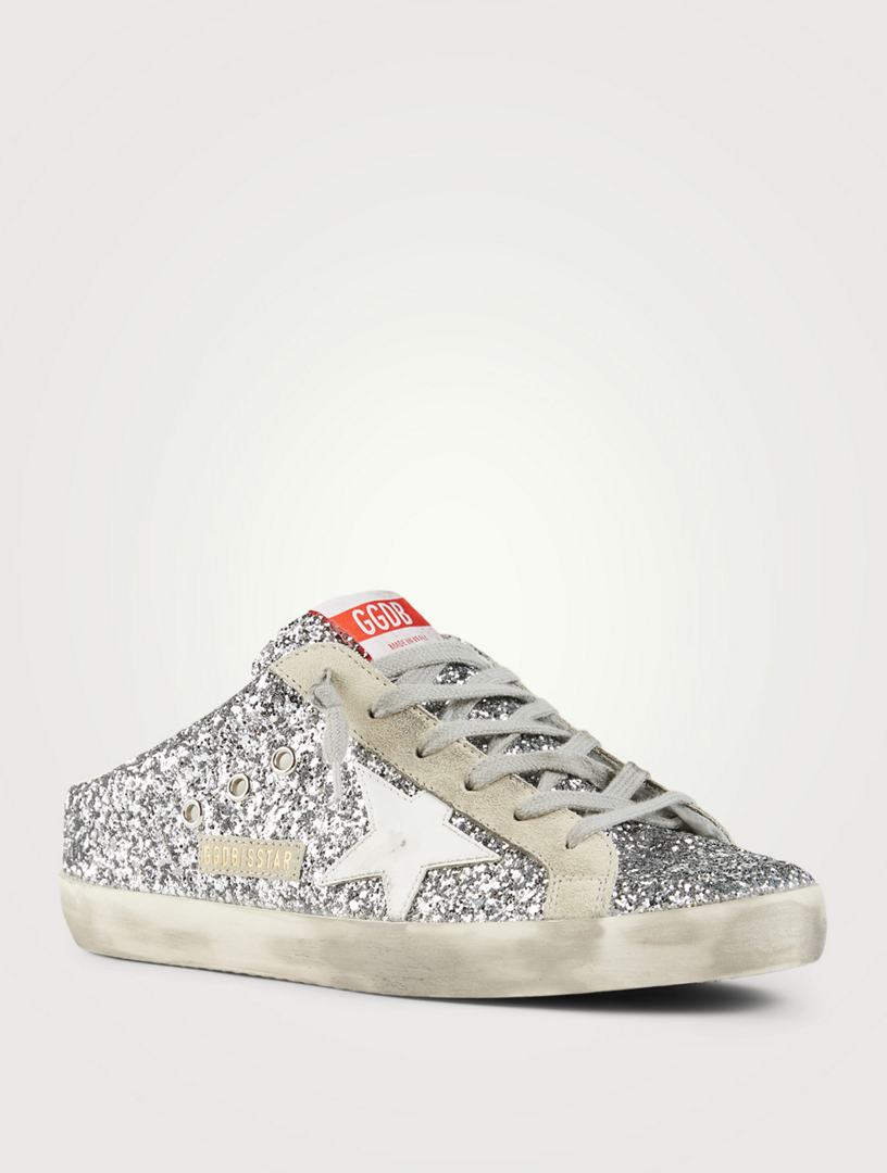 Signature stained rubber outsole. Round toe. Shearling lining. Made in Italy. Made in Italy. Round toe. Logo patch at tongue. Designer, Golden Goose Superstar Sabot Glitter Shearling Sneakers Golden Goose low-top sneaker in glitter fabric and suede with dyed shearling (Turkey) trim. Signature stained rubber sole.