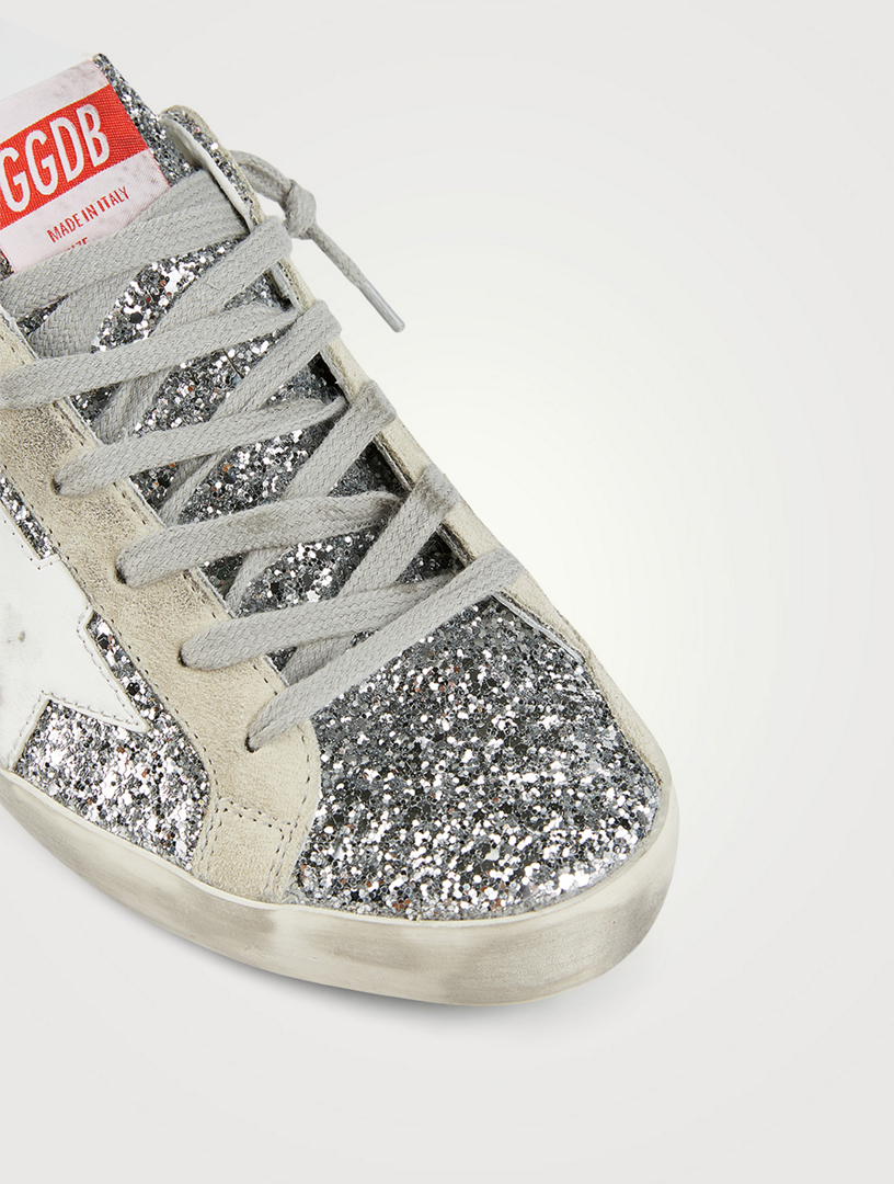 Signature contrast star at side. Designer, Golden Goose Superstar Tonal Glitter Low-Top Sneakers Golden Goose low-top tonal suede andleather sneakers with glitter trim. Golden Goose "Superstar" shimmery resined suedelow-top sneakers withleather trim. Logo lace-up vamp.