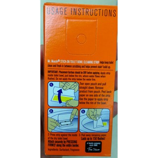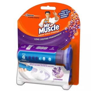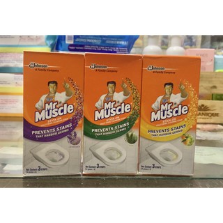 Remark: The expiration date format of the product is as follows: DD/MM/YY. Mr.Muscle Toilet Bowl Cleaner 3 PCS. Mr. Muscle Stick-On Toilet Bowl Cleaner Lavender 3 Strips Continuously cleans & fragrances. Description. It is inserted (or dropped) into the tanks water holding chamber behind the toilet seat.